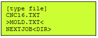 With this menu selection, a file on the ftp server memory can be sent directly to the CNC. The first files shown on the display are files on the ftp server memory from the most recently accessed directory. First you will need to select [SD Dir] or [USB Dir] depending on whether you wish to pull the file from the SD Card (LAN side) or the USB stick. Use the buttons on the right and the left to highlight a particular file, highlight [type file] to type in a file name, or select a new sub directory to display. Press the center button to make the selection desired.