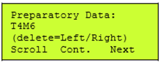 The mid-tape or preparatory text can be typed using the left and the right buttons under the display. The Scroll function is used to increment to another letter or number. Use the Next function to accept that character and move to the next character in the text. Use the Cont. function to accept this as the file name. A character can be deleted by pressing the Left and Right buttons at the same time.